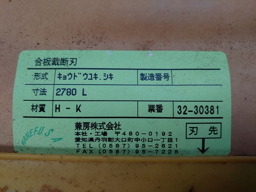 | 裁断機用刃物 | 共同 | KG-8 8尺用 | 長2780×巾140×厚16mm | |